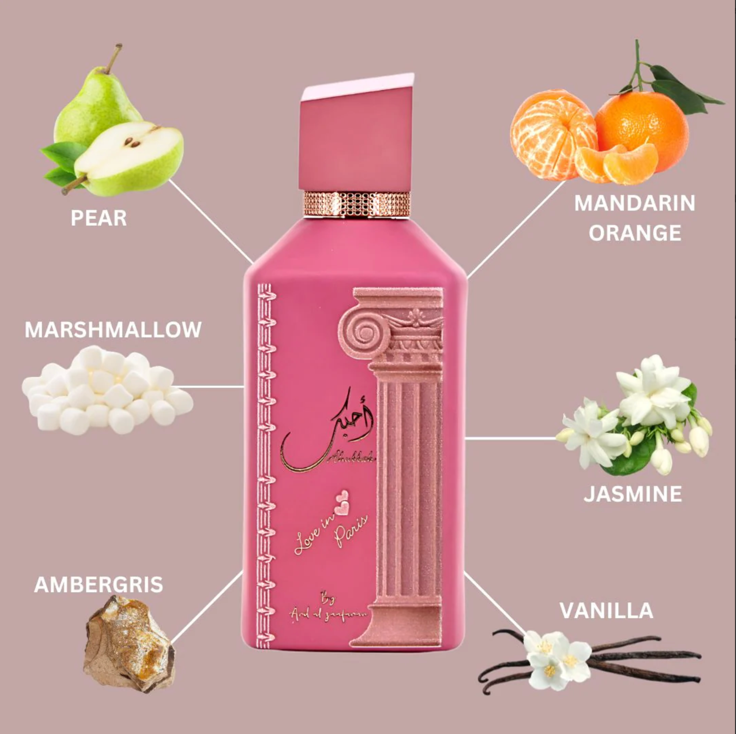 Ahubbak Love In Paris Eau De Parfum Spray 100ML (3.4 OZ) By Ard Al Zaafaran | A Delightful Fusion Of Tangy Fruits & Florals, Crowned With A Sweet Marshmallow Touch & Vanilla.
